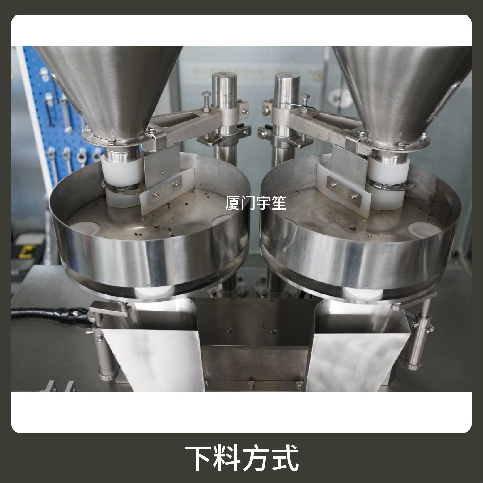 2、成品雙出,速度快,包裝流程全自動,無需人工操作??筛鶕?jù)充填物料的性質(zhì)選配不同的下料結(jié)構(gòu)。